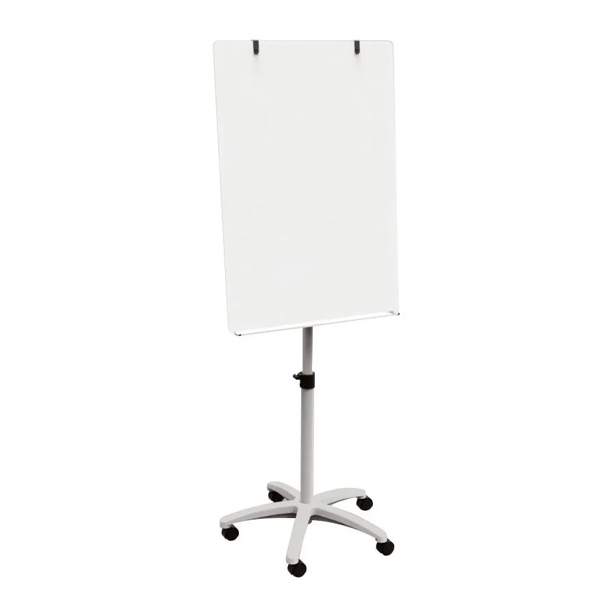 • New design magnetic glass flipchart stand on a single support and castor wheels.